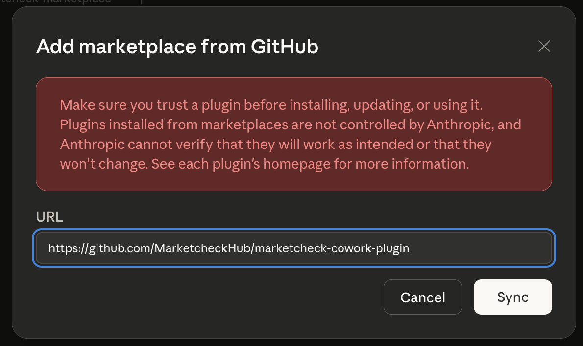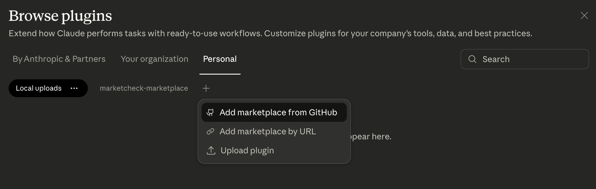 In Claude Desktop, go to Customize → Personal Plugins → Browse Plugins → Personal. Click the + button and select Add marketplace from GitHub.