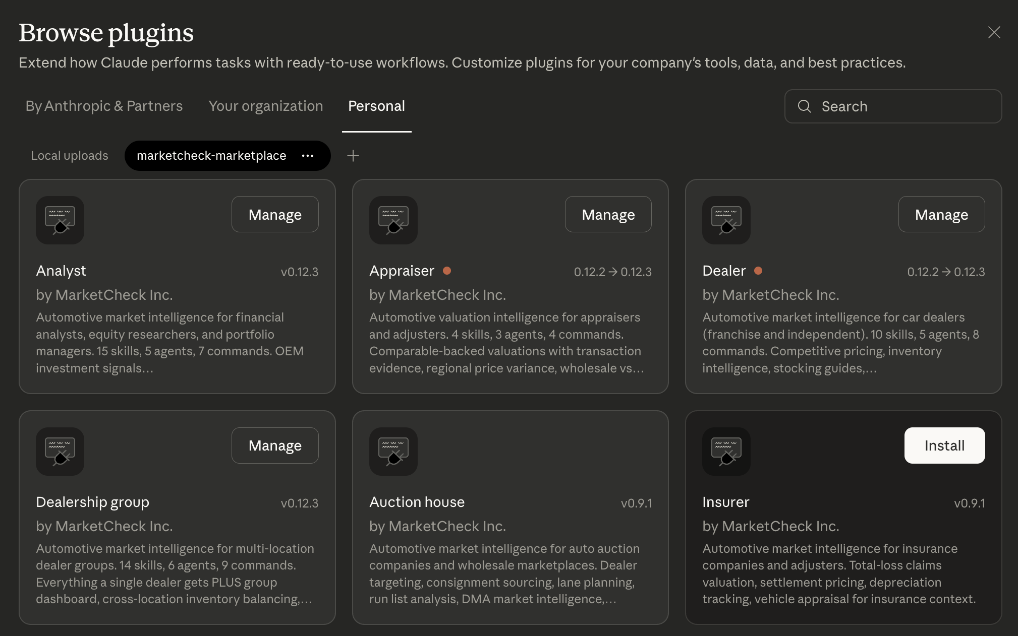 After syncing, you'll see the MarketCheck marketplace under the Personal tab. Browse the available plugins and click Install on the one that matches your role.
